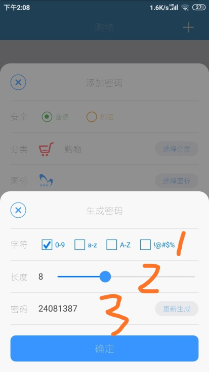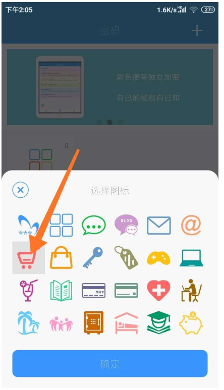 比如我们要保存的信息是淘宝账号,我们可以点击【选择图标】,在软件自带的图标中选择一个合适的,然后点击下方【确定】。然后输入分类名“购物”。