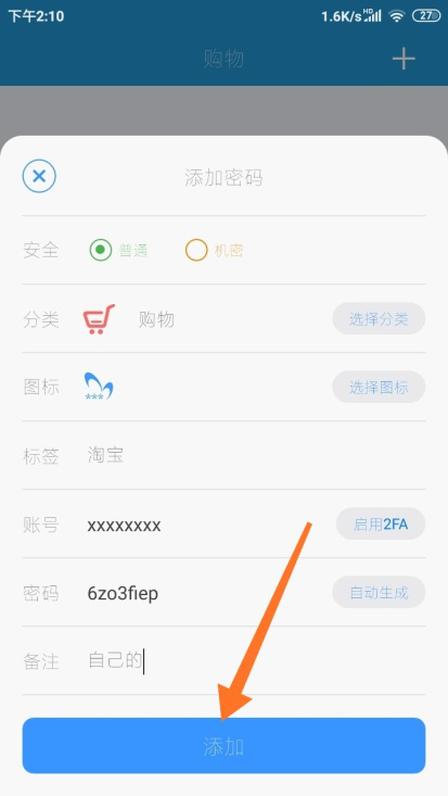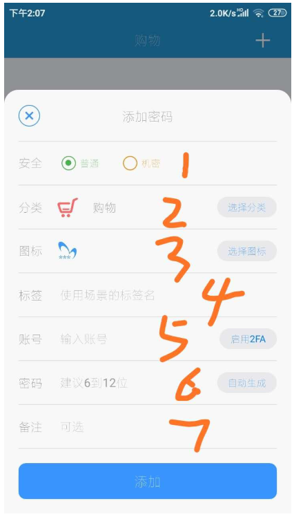 6、然后界面下方会出现【添加密码】的弹窗,在这个弹窗里一共有7个项目(如图),根据提示填写完成后点击最下方【添加】即可。