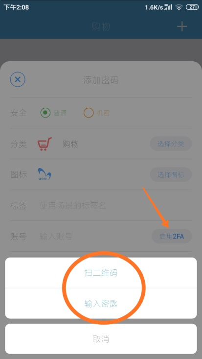 (1)对于第5项【账号】,可以在其“输入账号”的提示位置自行输入;也可以点击旁边的【启用2FA】,在弹出的对话框中选择“扫二维码”或是“输入密匙”。
