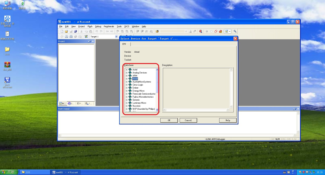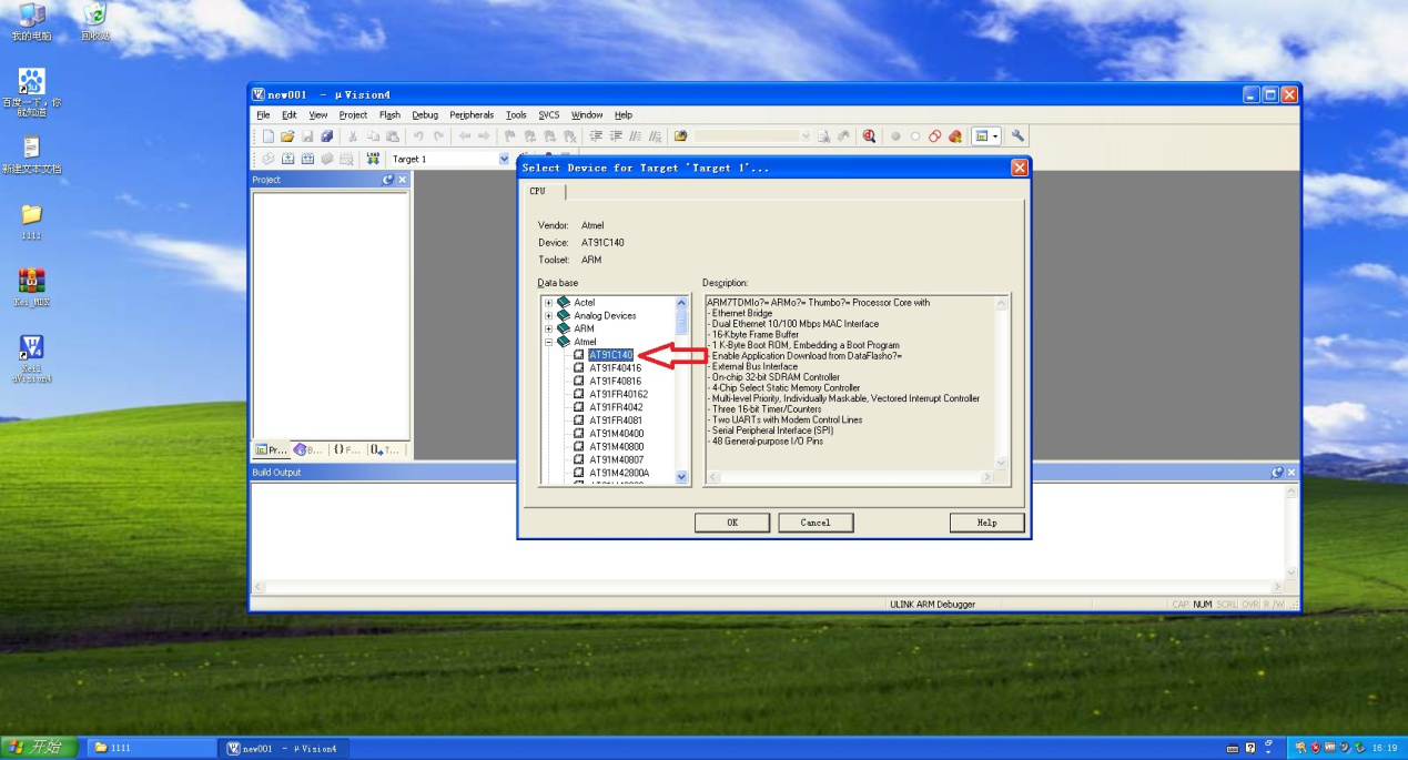 5、然后会弹出名为【create device for target1】(解释:为对象1创建策略,即选择程序将要在哪种单片机上运行)的对话框。在这里可以按照各自需要选择不同的单片机类型,比如图中选择了【atmel】出品的代号为【AT91C140】单片机。然后点击【OK】。