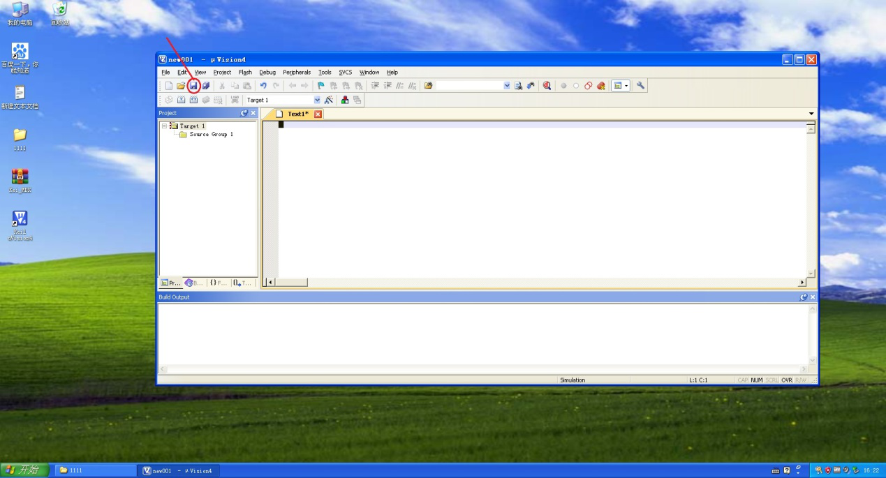 12、这个时候左侧工作窗【Project】中文件夹【Source Group1】的左边就会出现【+】。点开可以看到新建的程序文件【0001.c】。接下来就可以在右侧编写单片机程序了。