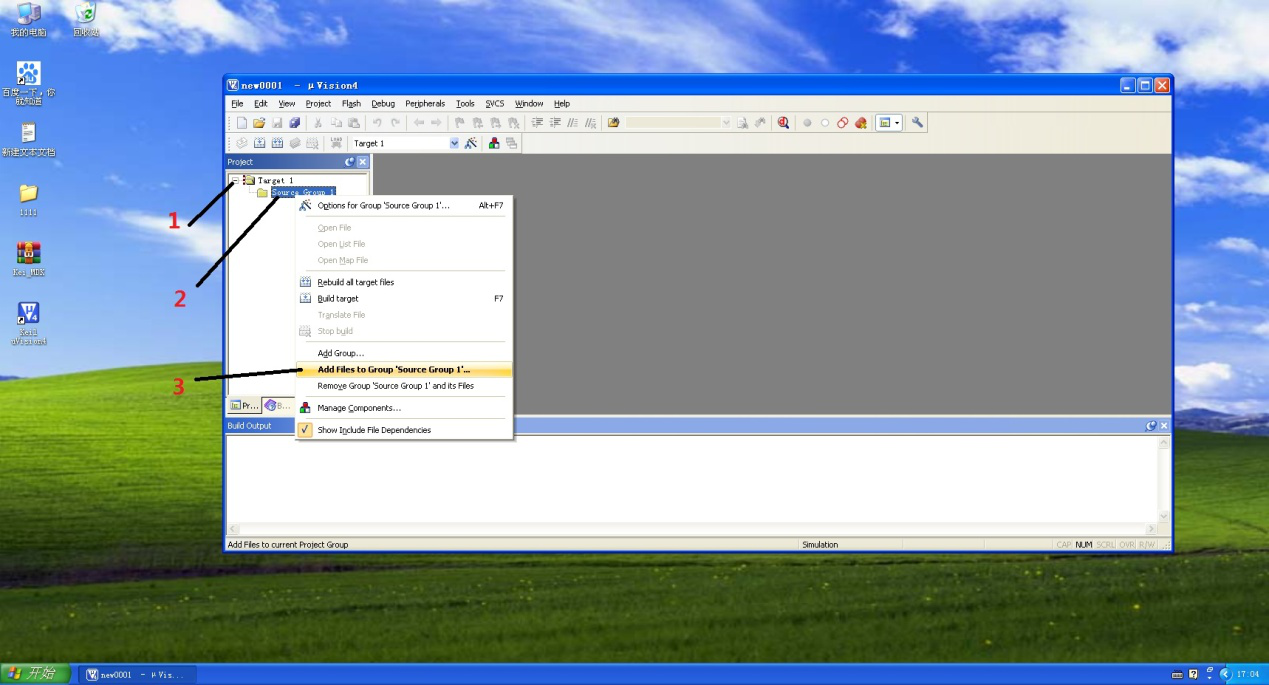 10、点开左侧工作窗【Project】(工程)中的【Target1】(对象1)最左侧【+】。右击【Source Group1】(源文件群组1),在出现的下拉菜单中点击【Add Fiel to Group\'Source Group1】(添加程序文件到源文件群组1)。