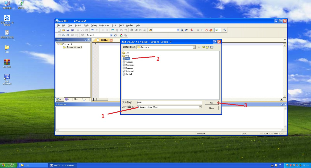 11、然后找到之前保存的.c文件,比如这里是0001.c。点击【Add】添加到工程里面。最后点击【close】,关闭对话框即可。