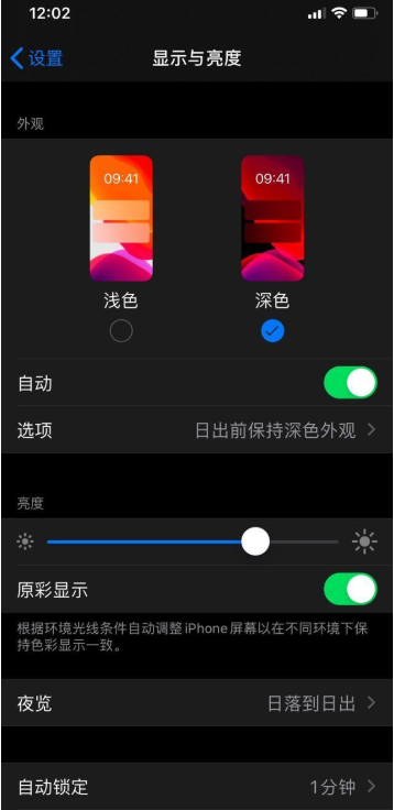 首先介绍微信暗黑模式,先将iOS微信升级到7.0.12版本,然后点击进入iPhone手机设置界面,点击【显示与亮度】——【外挂】——【深色】,再次打开微信,即可进入夜间模式。需要注意的是,你的iPhone手机必须使用iOS 13系统,否则无法启用微信夜间模式。