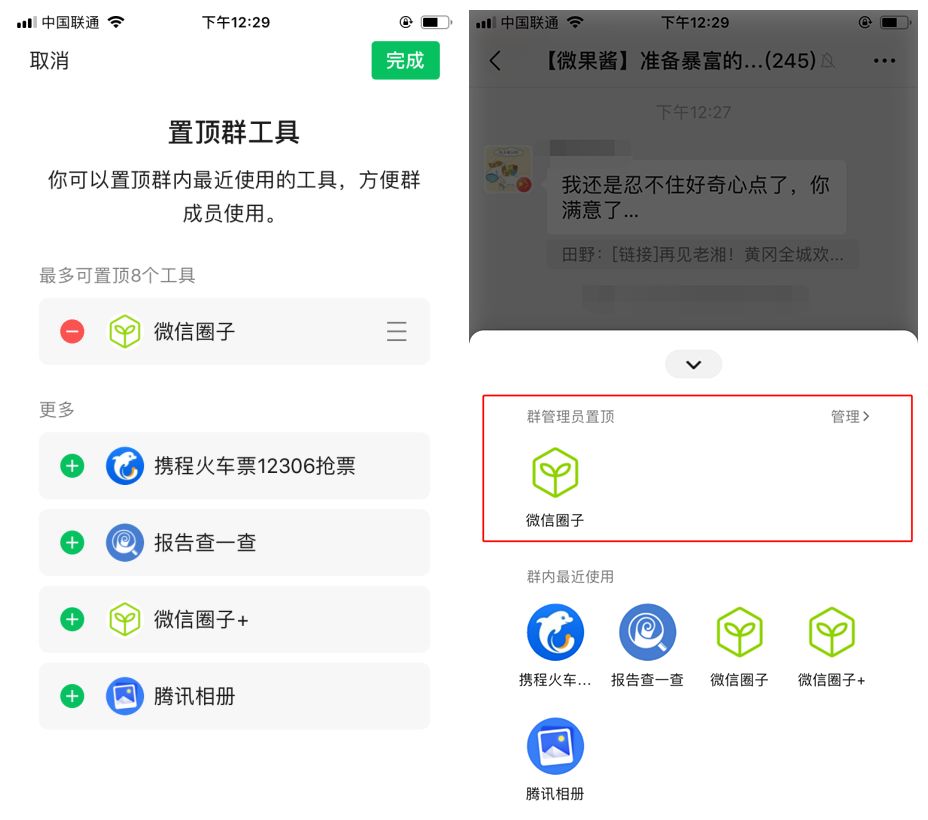将iOS微信升级至7.0.12版本,打开群聊,你会发现多了一个【群工具】,这里罗列了群友我来教你以及使用过的小程序,群主和管理员还可以选择置顶一些工具(最多8个)。