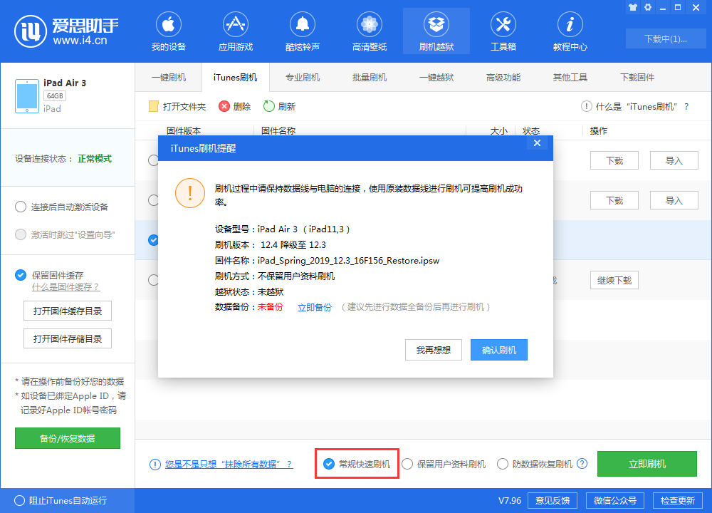 2、点击【iTunes刷机】,设备连接成功,爱思助手即会自动匹配可刷固件,选择自己需要的iOS固件版本,在下方勾选【常规快速刷机】,出现弹窗,阅读结束,点击【确认刷机】;