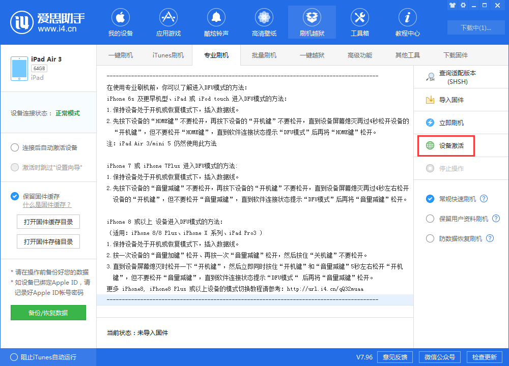 4、设备开机之后,点击【刷机越狱】——【专业刷机】——【设备激活】,你也可以在设备上进行手动激活。