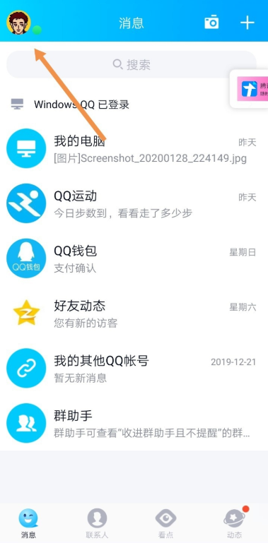 打开手机QQ,进入界面,如图,点击左上角的个人头像,