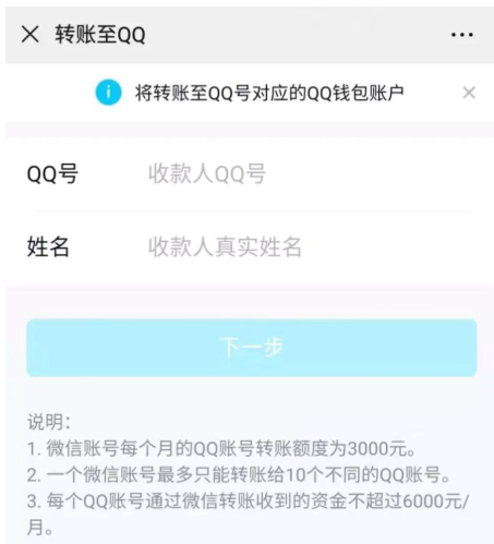 注意:微信直接转账到QQ无需手续费,但是转账金额和次数会有限制,单笔转账金额不能超过1000元,每个微信号每个月转出金额的上限为3000元,最多只能给10个不同的QQ号转账,每个QQ号每个月转入金额上限为6000元。