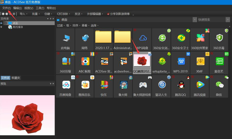 2、然后,在acdsee软件功能菜单栏出,点击“文件”将所需要的优化的图片打开。例如,这里,我们要对这朵玫瑰花进行优化编辑,就选中它。