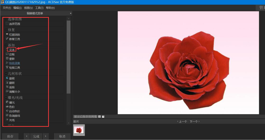 4、切换到acdsee软件编辑界面后,可以看到它有很多编辑工具,方便用户优化图片使用。这里举个例子,为图片添加文字,点击“文本”。