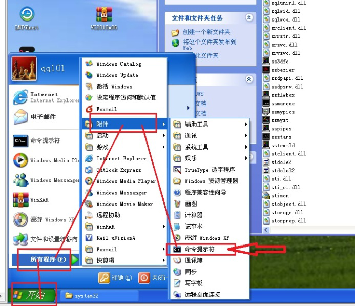 4、按图中依次单击【开始】-【所有程序】-【附件】-【命令提示符】,打开【命令提示符】。注意:也可以在【运行】中输入【cmd】直接打开命令提示符。