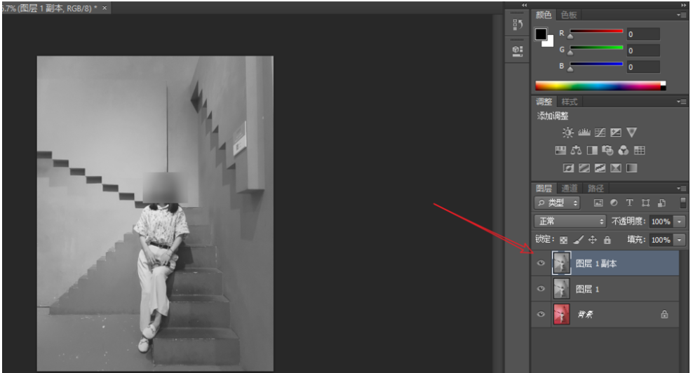 复制图层之后,点按快捷键【Ctrl+Shift+U】,进行图层去色,
