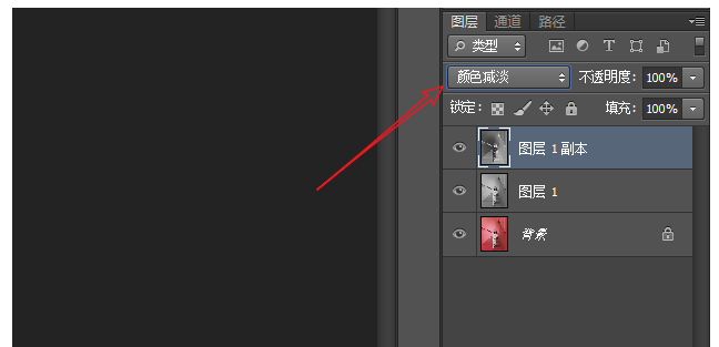 现在设置图层的混合模式,选择【图层1副本】,点击【颜色减淡】,