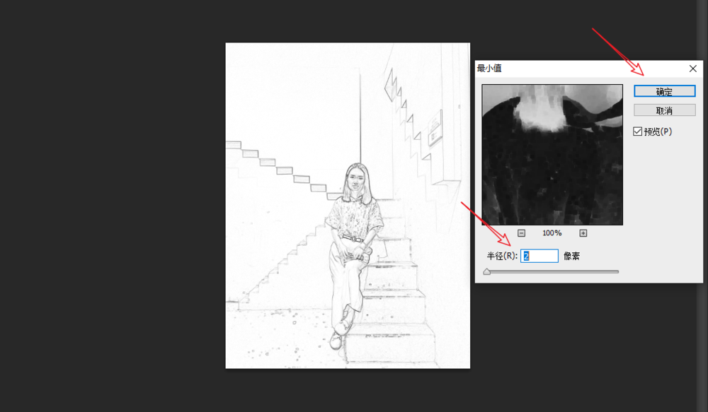 在菜单栏中点击【滤镜】——【其他】——【最小值】,弹出对话框,设置半径为2,点击确定,图片效果就发生了改变,