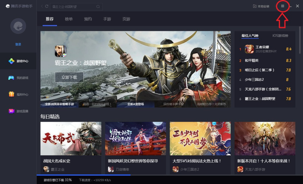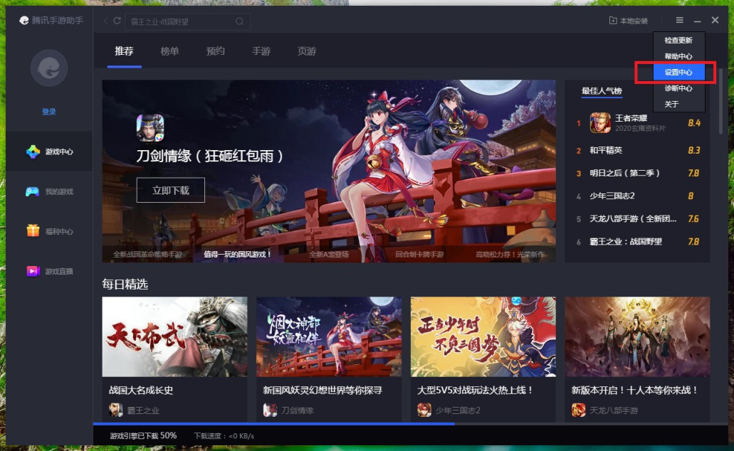 2、进入腾讯手游助手后,点击右上角三道横线图标。在下拉菜单栏里点击【设置中心】。