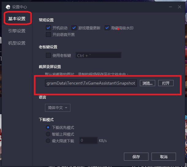3、进入设置中心对话框。首先选择基本设置,点击截屏录屏设置中的【浏览】,将截屏录屏保存位置更改到其他非系统磁盘上。