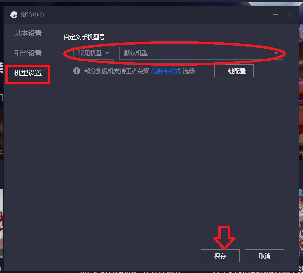 5、最后选择机型设置,点击选择【默认机型】,然后点击【保存】。重启腾讯手游助手即可。