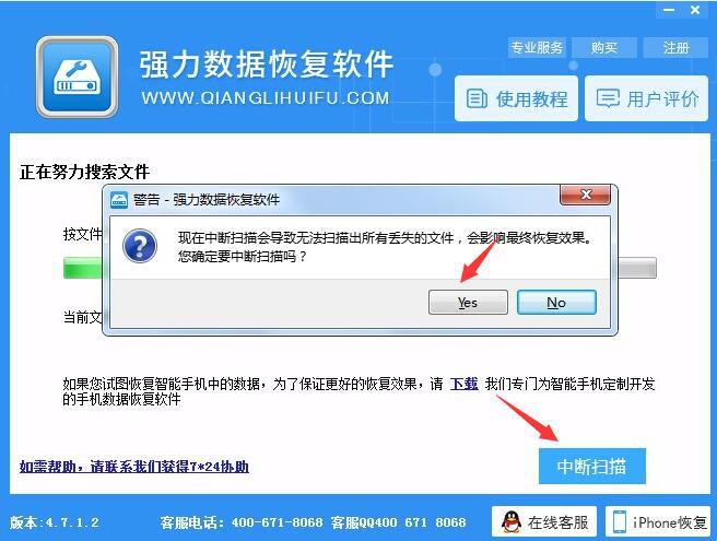 4、完成上一步操作后,强力数据恢复大师便开始进入扫描的状态。如果用户有事情需要离开一会,可以点击界面右下方的“中断扫描”并点击警告框内的“Yes”。