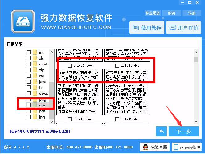 5、当扫描的步骤完成后,用户需要在强力数据恢复大师中勾选自己要恢复的通讯录内容,并点击界面右下角的“下一步”按钮,以设置备份文件所要存储的路径。设置好路径后,强力数据恢复大师便会自动执行恢复通讯录的指令。
