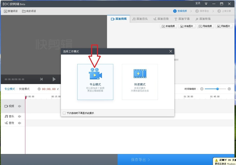 1、点击图标,打开快剪辑软件,点击右上角的“新建视频”,在选择工作模式对话栏中点击选择【专业模式】。