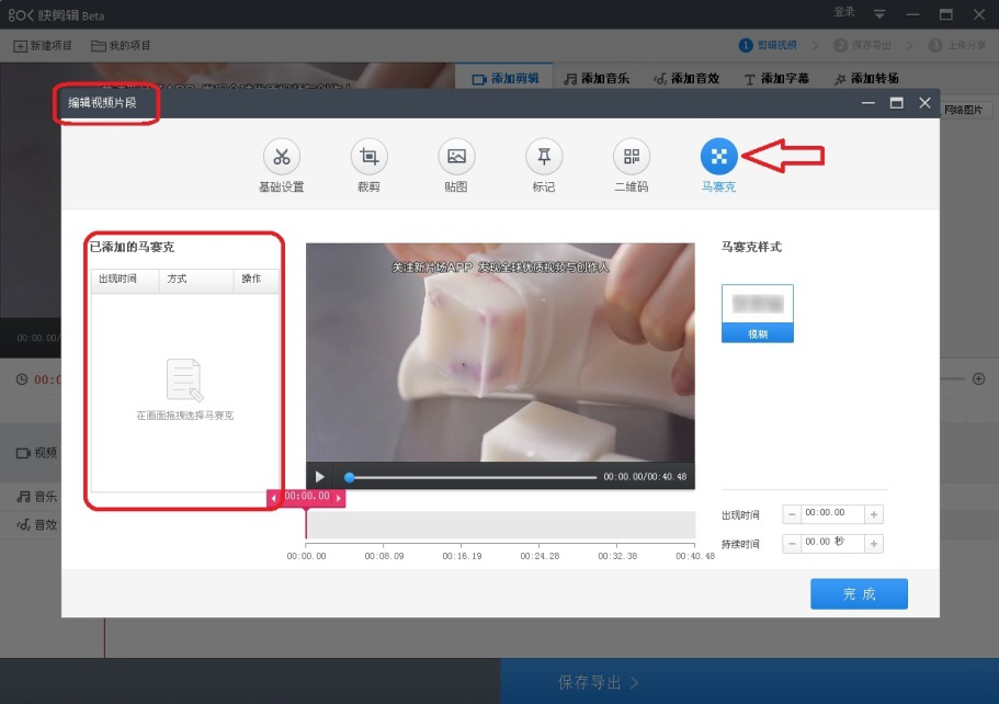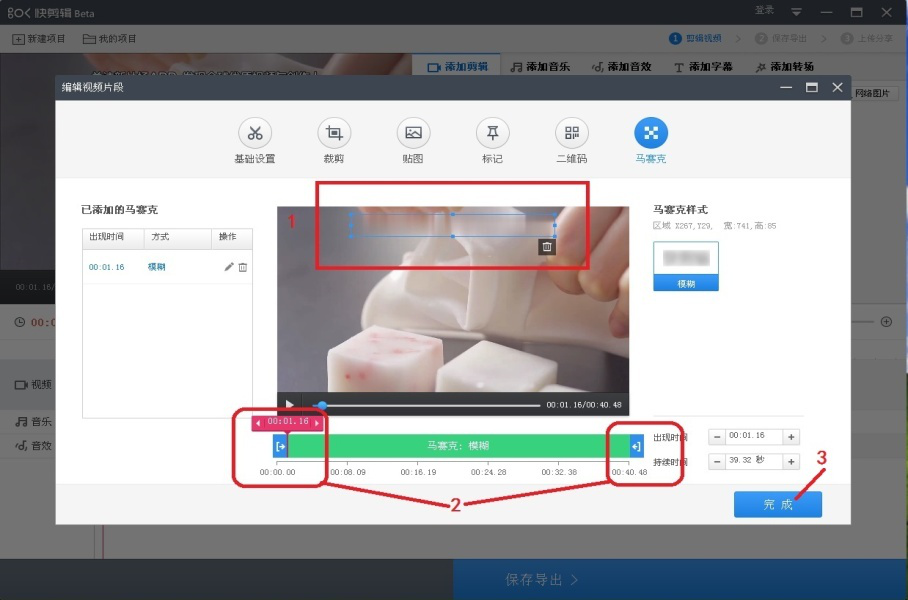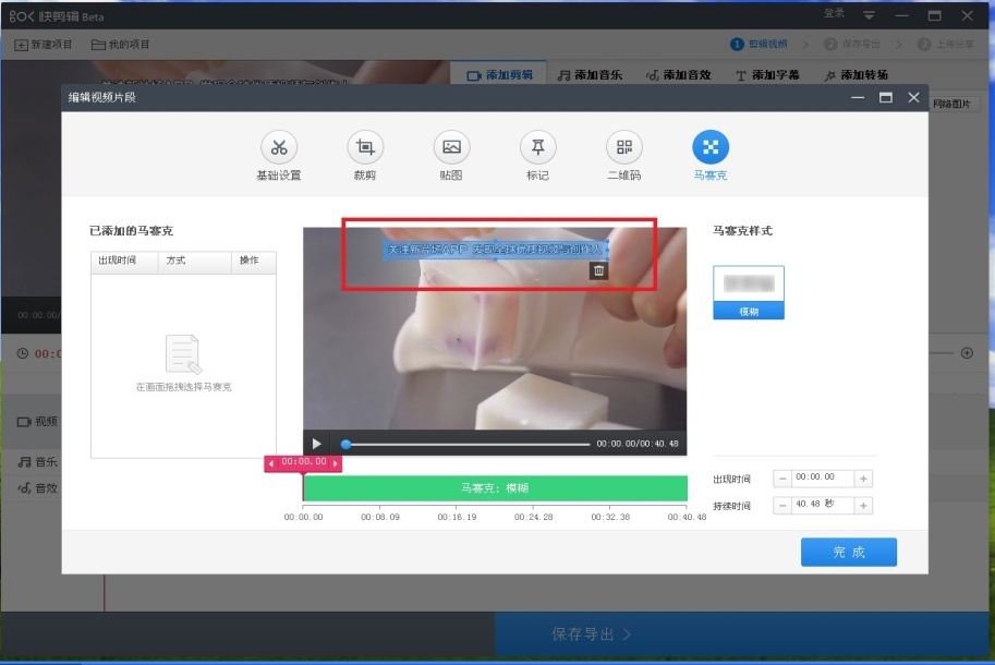 6、但需要去掉的水印或文字被框选时,水印内容会被去掉(如图)。然后通过调整“马赛克:模糊”这个绿框两端箭头,来调整马赛克存在的时间段。最后点击【完成】。