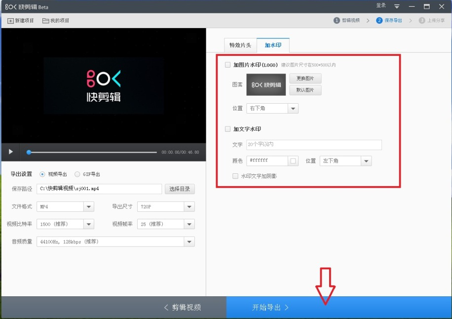 8、然后会出现如图界面。在这个界面你可以添加自己设计的特效和水印。如不用添加,则把方框中的对号都点掉(如图)。最后点击右下方【开始导出】。