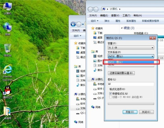 2、在格式化窗口中选择文件系统,一般选择默认的FAT32。然后点击开始。
