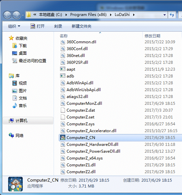 5、此时就会进入鲁大师程序的安装路径,并会自动选中ComputerZ_CN.exe文件(部分系统可能没有.exe字样),