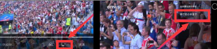4、之后,用户点击足球赛的视频,视频的下方便会出现央视影音投屏到电视上的图标,用户点击它即可投屏。并在视频的右侧搜索出支持投屏的电子设备。例如,这里是选择“客厅的小米盒子”。当连接成功后,央视影音会有投屏电视成功的提示。
