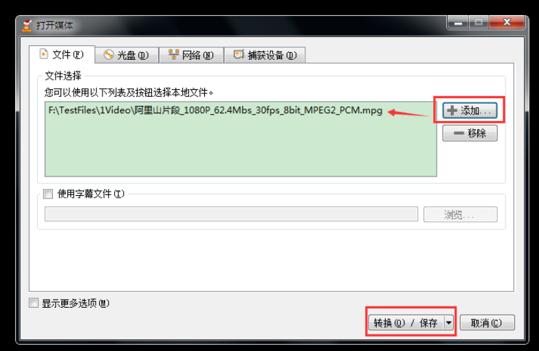 弹出新窗口,如图,点击【文件】选项卡,然后点击右侧的【添加】按钮,选择源视频,接着点击下方的【转换/保存】按钮,
