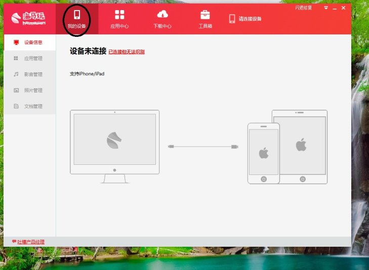 6、然后点击选择【我的设备】,将苹果手机用数据线与电脑连接。