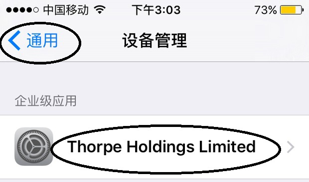 8、步骤很简单:在苹果手机上找到并点击【设置】,然后点击【通用】,在通用中找到刚才显示的未受信用的名称【Thorpe Holdings Limited】并点击;在之后的弹窗中选择点击【信任】即可。