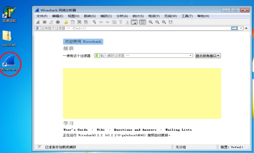 4、安装完成后,点击电脑桌面图标打开wireshark软件。