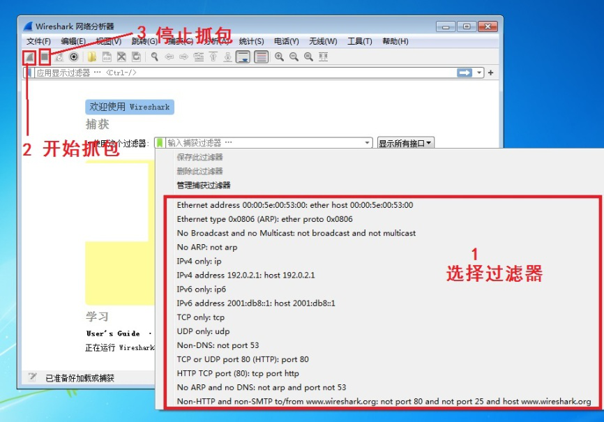 5、首先选择合适的过滤器,然后点击左上方第一个图标开始抓包,等待抓包完毕后,点击旁边的图标停止抓包。(如图)