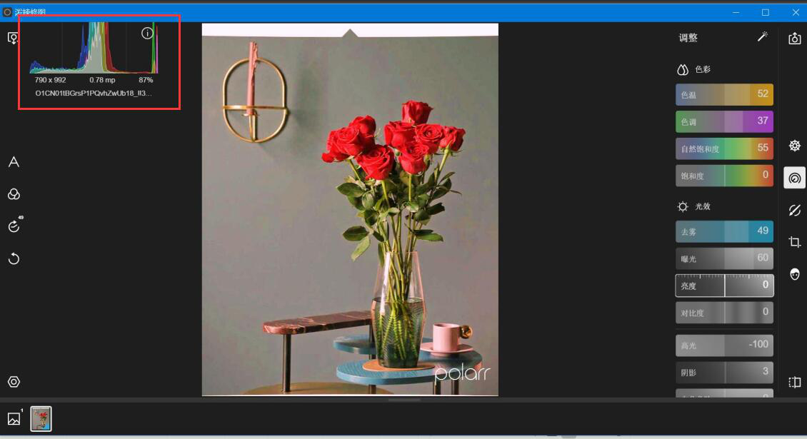 首先,打开一张图片,当鼠标点击图片的时候,泼辣修图的界面就会出现一个直方图,如下图。可以看到直方图主要是在左侧凸起的,说明这张图片的亮度是不够的。