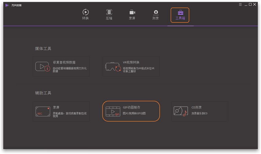 打开万兴优转,进入软件界面,如图,点击上方的【工具箱】标签,然后点击【GIF动图制作】功能,