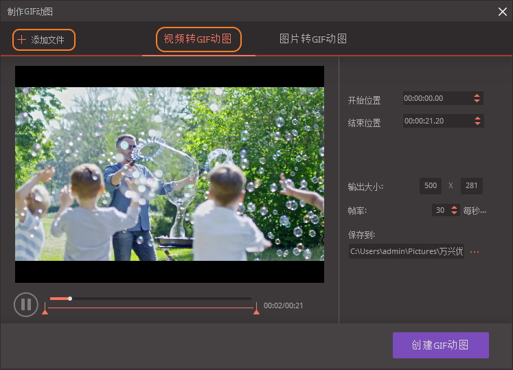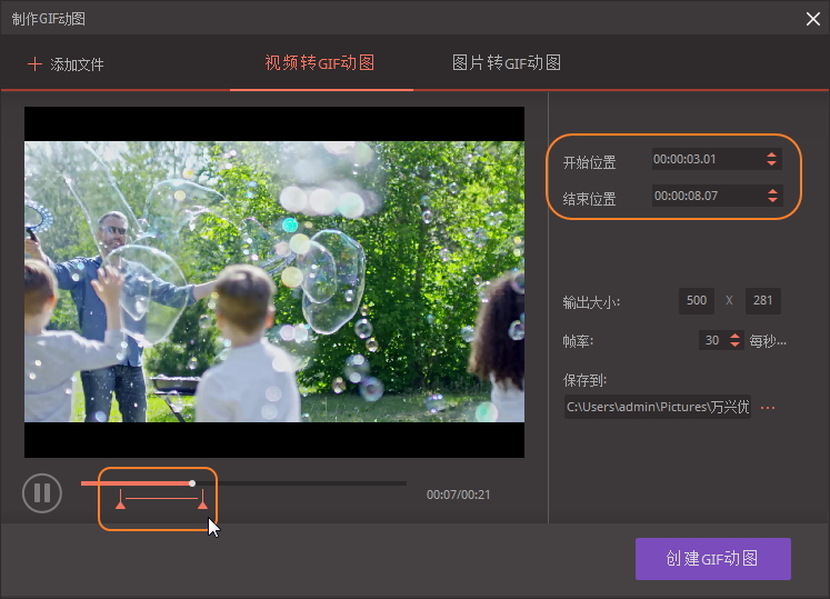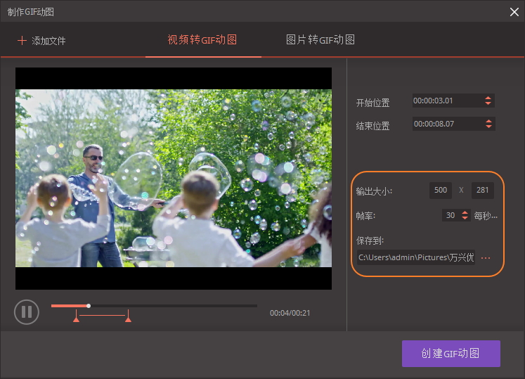 设置文件【输出大小】、【帧率】以及【保存路径】,然后点击【创建GIF动图】,即可将视频片段制作成GIF动图。