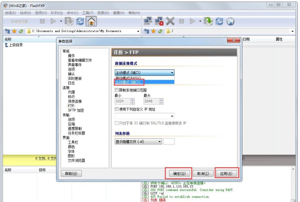 弹出窗口,如图,点击左侧的【连接】——【FTP】,然后在右侧面板找到【数据连接模式】,展开菜单,一个是主动模式,一个是被动模式,软件默认被动,这里将其调整为主动模式,