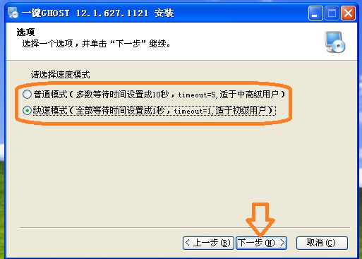4、根据需要点击选择普通模式和快速模式(两种均可)。然后点击【下一步】。