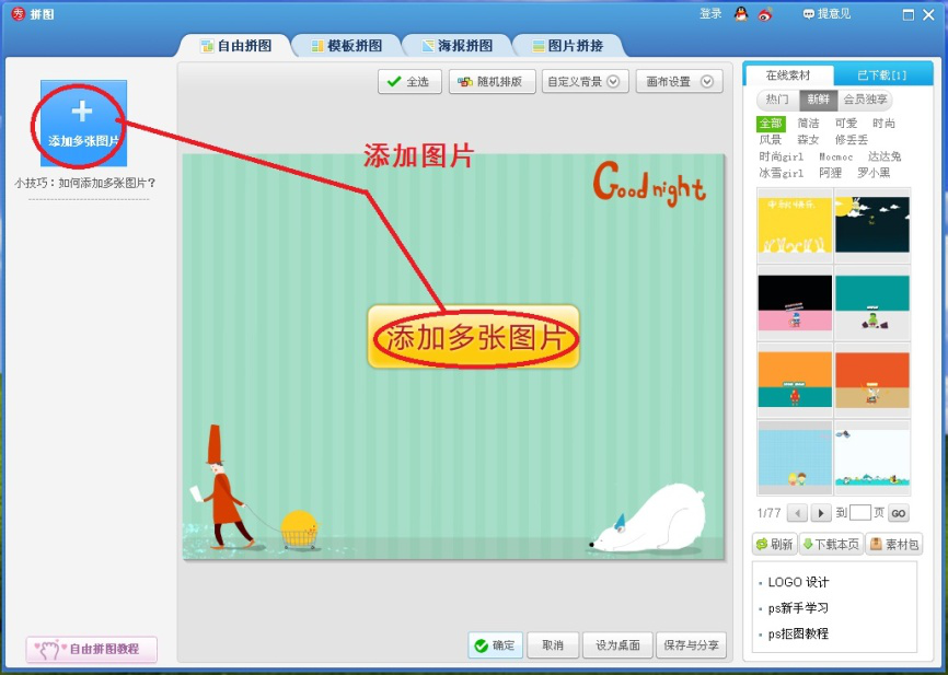 4、点击右侧【在线素材】,可以直接添加网上设计好的各种模板背景。