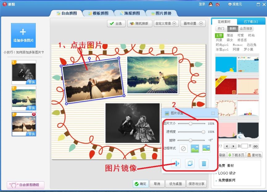 8、点击任一图片,在会弹出图片设置窗口。在这个窗口,可以对选中图片进行修改,比如更改图片大小、透明度、旋转角度、边框、镜像等等。可以根据需要拖动图片到画布任意位置。