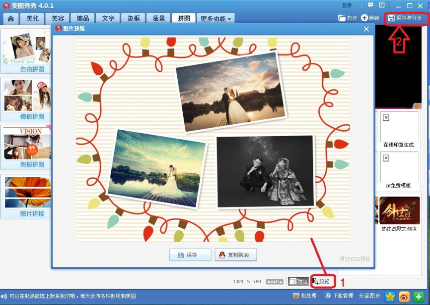 10、点击右下方【预览】,可以看一下设置好的拼图。然后点击右上方【保存与我来教你】。