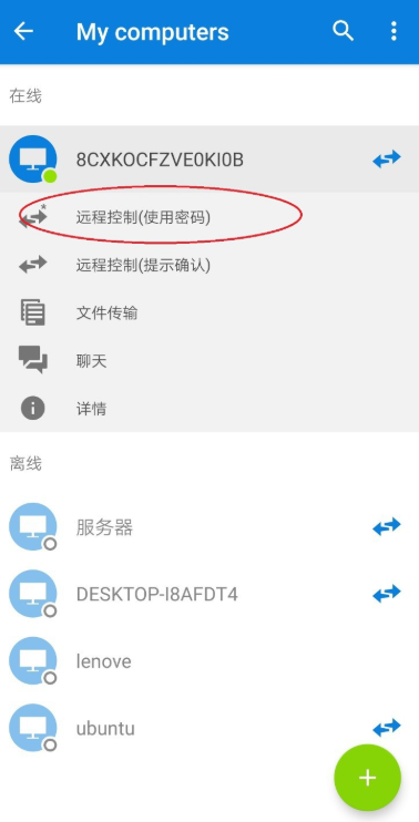如图,选择你要连接的电脑,点击【远程控制(使用密码)】,