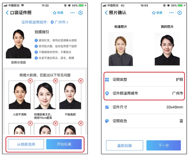 这里就以护照照片为例,你可以点击【拍照】,进行现场拍摄照片;或者直接上传手机相册中的照片,