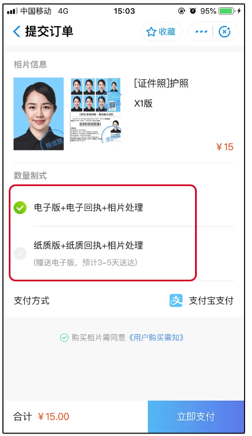 如果你对效果图非常满意,就不用做其他修改,接着选择是否制成电子证件照或是纸质证件照(包邮、赠送电子版),最后进行付款即可。