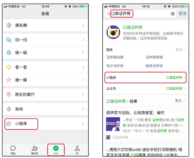 打开手机微信,进入界面,点击【发现】——【小程序】,输入【口袋证件照】,进行搜索,