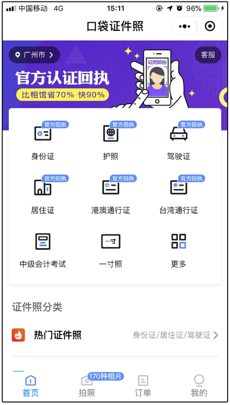 口袋证件照,一款拍摄证件照带回执的便民小程序,支持100多种证件照规格拍摄。,部分城市支持回执功能,以页面支持为准。