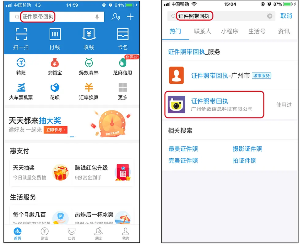 打开手机支付宝,进入首页,在搜索栏中输入【口袋证件照】,得出结果,点击口袋证件照服务,