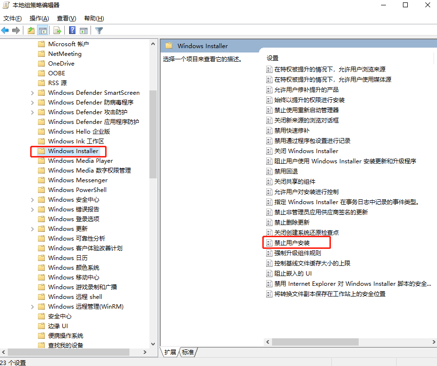 如图,依次点击展开【计算机配置】——【管理模板】——【Windows组件】——【Windows Installer】,然后在右侧面板找到【禁止用户安装】选项,双击打开,